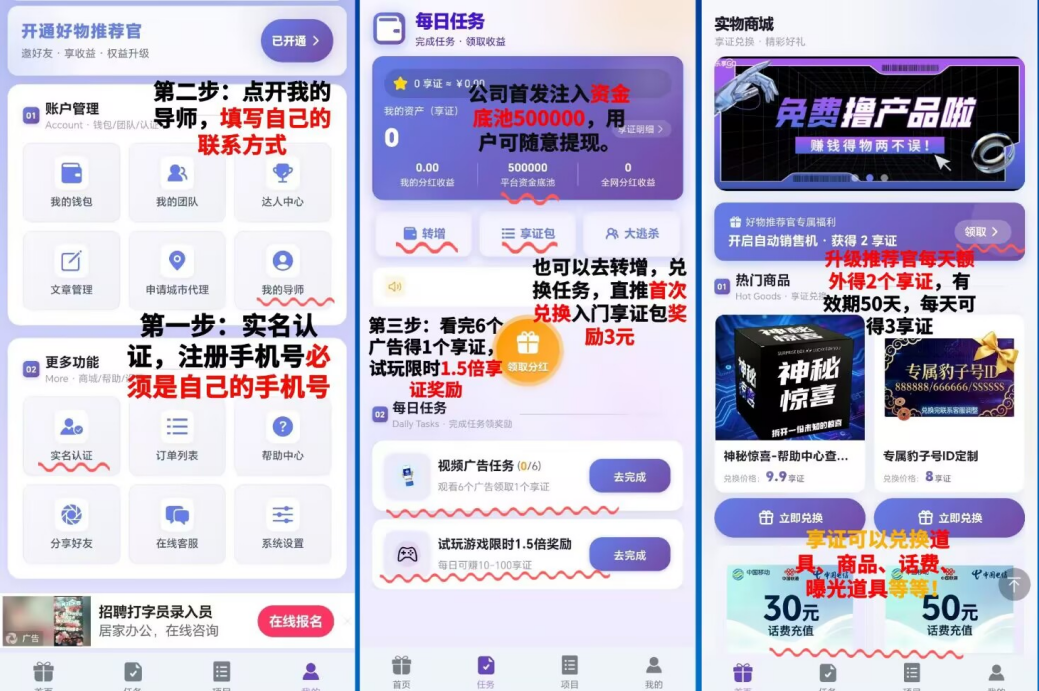 享证可兑换更多享证包,兑换的享证包越多,每日产出越多,亨证10的倍数可转赠,亨证可用于领取**奖励、充话费、兑换各类商品,如护肤品、家用产品、厨房用品、数码商品等。