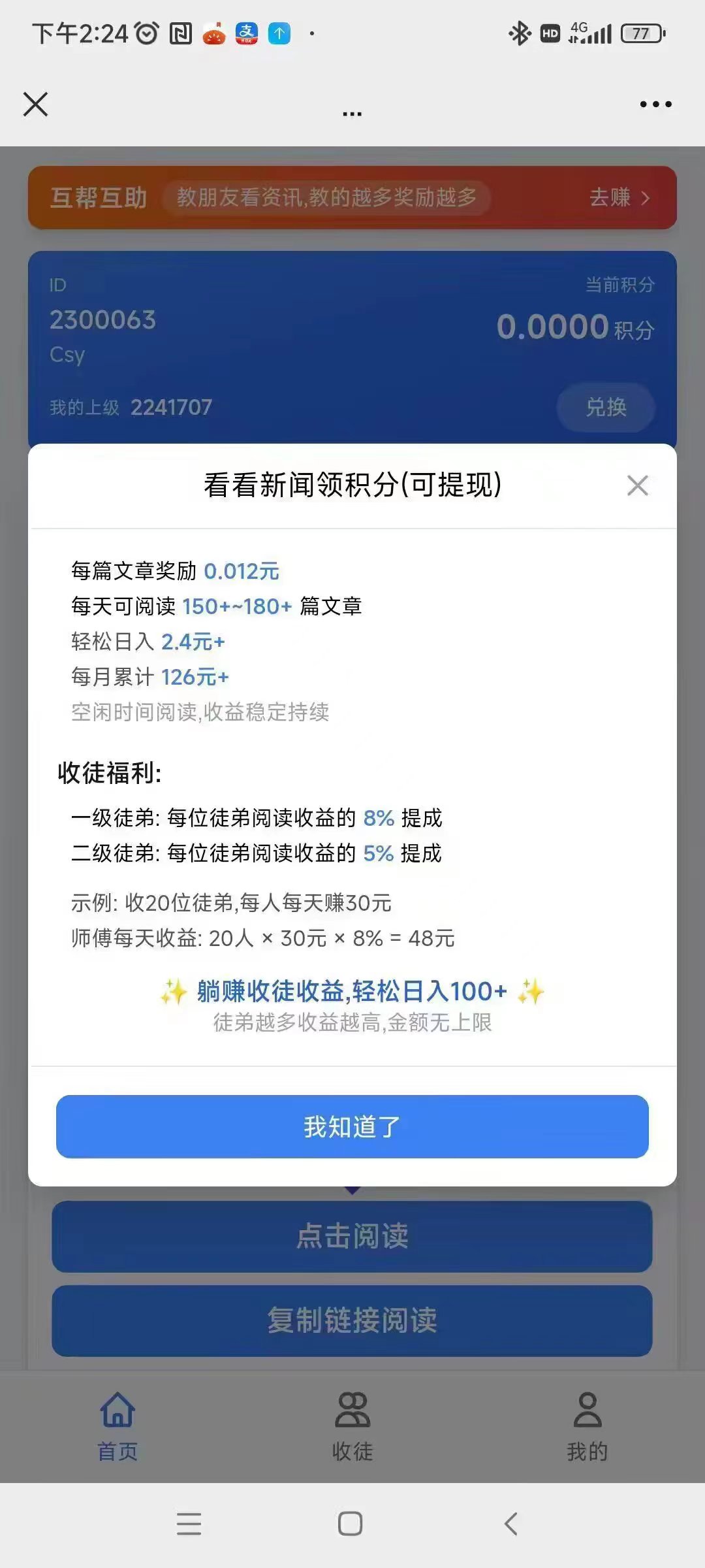 正文 新多多阅读首码,多号多得,半自栋的操作方式 起 V评论者 /昨天 /0 评论 /116 阅读 0427 温馨提示: 文章均来自网络用户自主投稿,风险性未知,涉及注册投资需谨慎,因此造成损失本站概不负责! 新多多阅读,一个超稳定的纯0撸首码项目,适合拥有多个微信号的用户进行多号操作。通过半自栋的操作方式,用户可以在短时间内完成阅读任务并提现。新多多阅读,微信扫码2-3秒直接点返回下一篇.0.3起提秒到vx,撸低保单号一天2-5米 多号多得!码要是不能用加我V重新拿码投诉/删帖