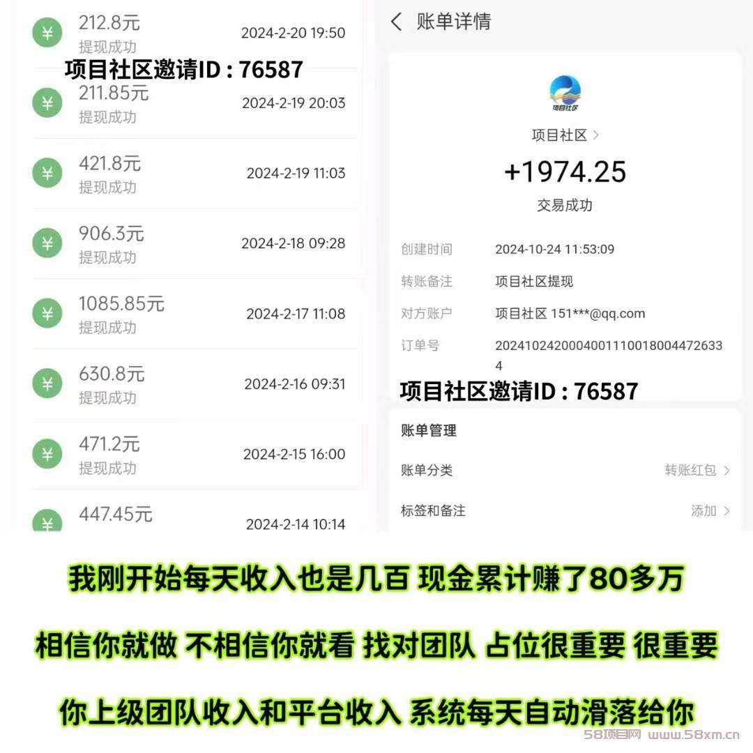 欢迎加入我团队,现在我总收入80万+,静态滑落收入32万+,我团队几十万人,我所有团队收入,系统每天自动滑落给你。