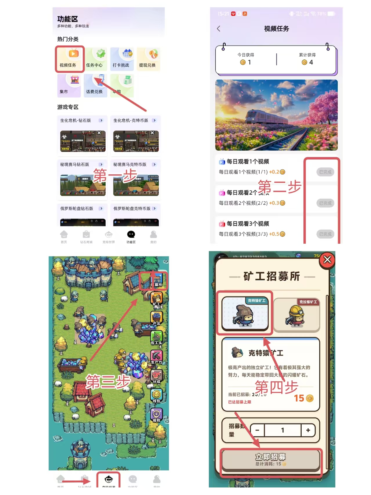 首先注册进来后先实名认证,然后就可以去完成视频任务,看6个广告视频后就可以领1个克特币,然后去招募矿工就可以了。每个矿工每日产出0.623个矿石,现在单价1.5一个,如下图所示: