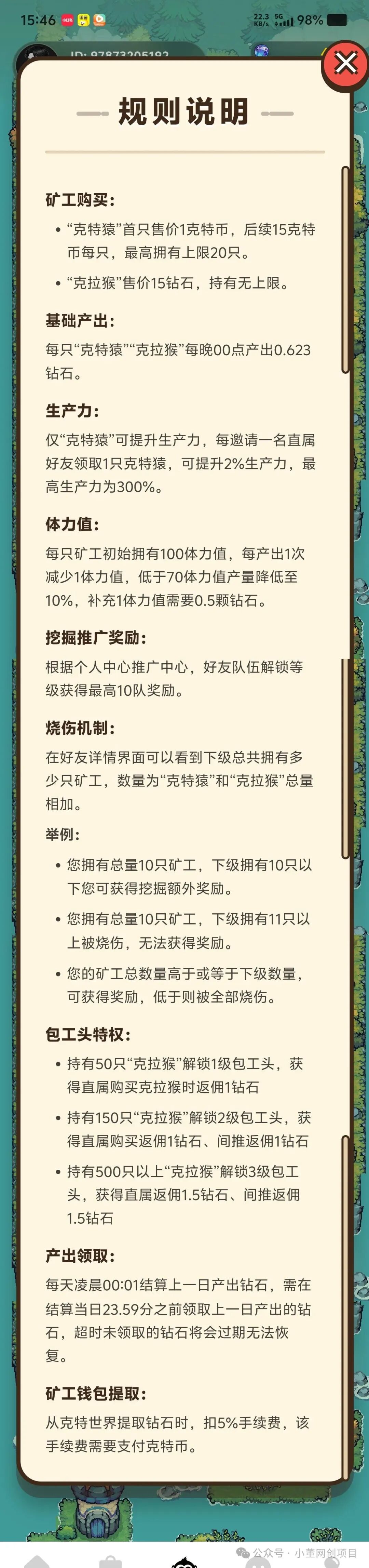 克拉猴矿工:每只每天产出0.623个钻石,持有数量无上限,克拉猴数量达到一定数量的时候可以自动开通包工头特权:
